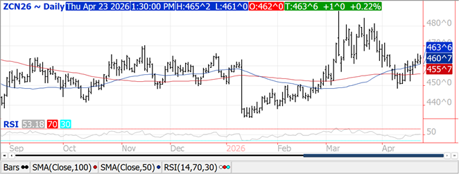 Prices were $.01-$.02 higher in choppy 2-sided trade.  Spreads were mixed and little changed.  July-26 held support at its 50-day MA while holding near the midpoint of its $4.50-$4.80 range.  The  BAGE held their production forecast unchanged at 61 mmt, well above the UDSA forecast of 52 mmt.  Harvest was reported as only 26.5% complete.  US lawmakers continue to make a push for the year-round sale of E-15.  While the pace of US planting will be slower than normal in the last week of April, they will likely remain above their historical average.  Export sales at 69 mil. bu. was in line with expectations and brought old crop commitments to 2.917 bil. bu. up 28% from YA, vs. the USDA forecast of up 15.5%.  Commitments represent 88% of the USDA forecast, above the historical average of 84%.  Noted buyers were Korea – 14 mil., Japan – 13 mil. while Mexico bought 17 mil. bu. of new crop.  US corn acres in drought rose 1% to 27%.