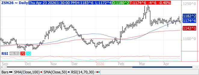 Prices were mixed with beans steady to $.05 lower while both meal and oil were little changed.  Oil spreads weakened; meal spreads firmed while bean spreads were mixed.  After rejecting trade above $12 yesterday, July-26 beans slipped back near the midpoint of its $11.55-$12 range.  July-26 oil held support just above $.70 lbs. setting up the late day recovery.  Support for July-26 meal is at its 100-day MA at $315.  Spot board crush margins rebounded $.04 to $3.33 ½ bu. while bean oil PV held near all-time highs at 52.8%.  Energy prices firmed late after Pres. Trump ordered the US Navy to “shoot and kill any boat” laying mines in the Strait of Hormuz, threatening the fragile ceasefire agreement.  As the Strait remains mostly closed, peace talks apparently are on hold.  Speculative traders turned moderate sellers across the soybean complex yesterday.  Look for the CFTC to print another record large long position held by MM’s in soybean oil, and a combined record long position across the complex.  The markets attention will start shifting to Pres. Trump’s meeting in Beijing with Chinese leader Xi next month.  Without additional Chinese purchases the USDA export forecast will likely be lowered again, which will likely again be offset by higher crush.  Bean exports at 13 mil. were in line with expectations.  YTD commitments are down 18% from YA in line with the USDA forecast.  Sales to China for the 25/26 MY are below US/China Trade War I levels from the first Trump Admin.  Shipments to China are up to 10 mmt.  Meal sales at 162k tons were below expectations and bring YTD commitments to 14 mmt up 17% YOY vs. the USDA forecast of up 6%.  Bean oil sales at 3.3 mil. lbs. bring YTD commitments to 803 mil. lbs. down 62% YOY vs. USDA forecast of down 52%.