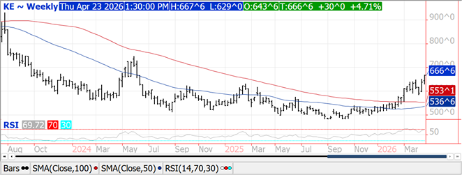 Prices surged $.08-$.30 with KC futures leading the way.  CGO July-26 jumped out to a 3-week high.  KC July-26 reached a 22-month high while MIAX July-26 hit a 9-month high.  While much of the nation’s midsection will see moderate to heavy rainfall over the next week, some areas in the SW plains will likely remain arid.  Early ideas on US winter wheat production is just below 1.20 bil. bu., a 4-year low and compares to 1.329 bil. YA.  For HRW futures (KC) to test the $7.00 level would likely take production falling below 600 mil. bu. vs. 804 mil.  The BAGE forecasts Argentine wheat planting will drop 3% in 2026 to 6.5 mil. HA citing higher fertilizer costs weighing on profit margins.  With US wheat largely pricing itself out of the global marketplace, exports were only 5 mil.  Old crop commitments at 900 mil. bu. are still up 15% from YA, vs. the USDA forecast of up 9%.  Not even wire service reports that east coast flour mills bought upwards of 120k mt of milling wheat from Poland, shunning more expensive supplies from the US, could hold wheat prices back due to large scale speculative buying.  US winter wheat acres in drought jumped another 2% to 70%.