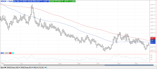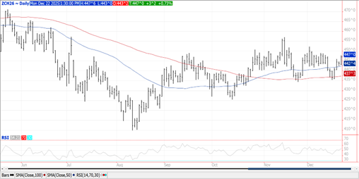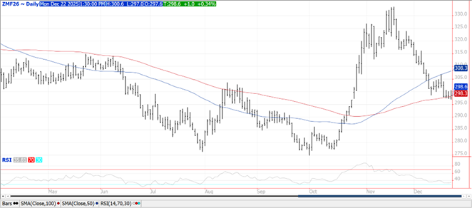 Prices were $.02-$.03 higher with spreads slightly firmer. Mch-26 futures traded above LW’s highs however remain in a $4.35-$4.55 range. MM’s sold just over 13,500 contracts in the week ended Dec. 9th cutting their long position to just under 10k contract. Export sales for the week ended Dec. 4th at 58 mil. bu. brought YTD commitments to 1.804 bil. bu. up 30% from YA, vs. the USDA forecast of up 12%. Export inspections at 69 mil. bu. were in line expectations and above the 61 mil. needed per week to reach the USDA forecast. YTD inspections at 955 mil. are up 68% from YA. Noted buyers were Mexico – 21 mil., Korea – 16 mil. while Japan and Spain took 9-10 mil. each. Friday’s COF data showed cattle numbers down 2% from YA, however placements at 11% below YA vs. expectations of down only 8%. The USDA’s feed usage forecast at 6.1 bil. bu. up 11.6% YOY, is at least 100-200 mil. bu. too high. US exports likely to remain strong with US competitively prices into 2nd Qtr. of 2026.