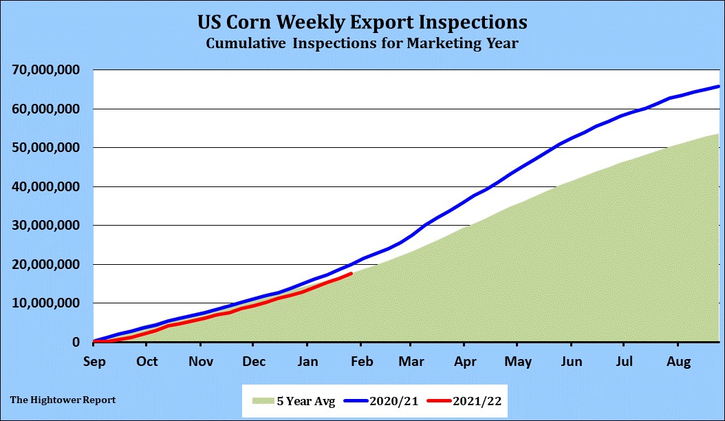 Wheat futures traded lower. Wheat futures traded lower on less talk about Russia invading Ukraine. Russia UN Ambassador said that there is no proof of Russia invading Ukraine despite Russia troop buildup on the Ukraine border. There is continued talk that Russia final wheat exports could be closer to 32 mmt versus USDA 35. Fact that Egypt tender was at prices lower than expected with French wheat even lower than Russia or East Europe. Slow US wheat export shipments and fact US HRW export prices are still a discount to EU and Russia offers resistance. Weekly US export inspections were near 13 mil bu vs 15 last year. Season to date exports are near 499 vs 608 last year. Parts of US south plains could see some moisture in the form of snow and freezing rain. Up until today, in January Chicago wheat futures were up 23 cents, KC wheat up 11 cents and Minneapolis wheat was down 52 cents. Nearby corn futures were up 47 cents. Oat futures were up 115 cents