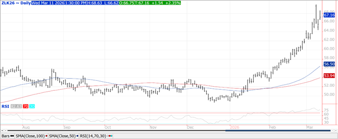 Prices were higher across the complex with beans up $.10-$.13, meal was steady to $1 higher while oil finished up just over $.01 ½ per lb.  Bean and meal spreads firmed while oil spreads were mixed.  May-26 beans were up $.12 closing about midrange and below this week’s high of $12.33 ¾.  May-26 meal rejected early trade below its 100 day MA at $312.10.  Although May-26 oil was up $.01 ½ lb. it closed in the lower half of the day’s range.  Speculative buyers are anticipating supportive RVO and SRE announcements from the Trump Administration this month while RIN values also rally.  Energy prices continue to recover from yesterday’s midday plunge which was fueled by false reports that the US Navy escorted a tanker thru the Straits of Hormuz.  Limiting the upside today were reports the US military sunk several Iranian ships, including minelayers near the Straits of Hormuz, while the IEA revealed a plan for member countries to release up to 400 mil. barrels of oil from strategic reserves, more than double the 182 mil. gallons released in 2022 shortly after the Russian invasion of Ukraine.  Spot board crush margins rebounded another $.06 ½ to $2.18 ½ with bean oil PV jumping to 51.6% just below their all-time highs.  US Treasury Sec. Bessent and USTR Greer are expected to meet with Chinese trade officials in Paris this weekend ahead of Pres. Trump/Xi meeting in Beijing in late March.  Bulls remain hopeful for fresh Chinese purchases despite US Gulf FOB offers running $1.00-$1.30 over Brazilian offers into the summer months.  US ending stocks at 350 mil. bu. is arguably bearish from these price levels, however with the potential for additional Chinese buying and stocks closer to 300 mil. bu. is drawing the speculative interest.  Surging input prices is also limiting farmer selling despite the price surge.  Stocks/use among major global exporters ticked up to 19.5%, consistent with the past 6 MY’s.  Tomorrow’s export sales are expected to range between 10-30 mil. bu. of beans, 150-350k tons of meal and 0 to 15k tons of oil.