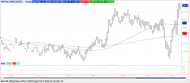 Prices ranged from $.03 to $.05 higher.  CGO May-26 held within yesterday’s range.  CGO and KC spreads were mixed.  KC May-26 spread over CGO grew to over $.20 intraday having rallied over $.30 since late Feb-26 as the SW plains continue to miss out on rainfall.  US ending stocks were left unchanged at 931 mil. bu. while global stocks drifted down to 277 mmt.  Safras & Mercado forecast Brazilian acres in 2026 will fall 15.5% from YA to 1.985 mil. HA.  Production is expected to drop 14.5% to 6.85 mmt, below the USDA forecast of 8 mmt.  Stocks/use among global exporters held steady at 17.7%, the highest in 7 years.  A South Korean flour mill reportedly bought 32k mt of US milling wheat.  US FOB offers remain positioned well above Black Sea and Argentine offers.  Export sales are expected to range from 8-16 mil. bu.