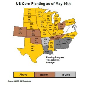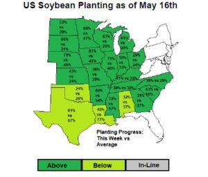 SN traded lower on talk that 16.00 may have ration US demand. US soybean exports have slowed and NOPA crush was lower than expected. Lower crush supported soyoil futures. There remain some concern over Asia vegoil demand especially in India where virus continues to spread. Support had been found earlier on talk that USDA 23 mmt increase in World 2021/22 soybean crop offered resistance. Still, these numbers include record 2022 Brazil soybean acres and yield. It also include record US 2021 acres and yield. Finally it includes 3 pct increase in Argentina 2022 acres and 7 pct increase in yield. This might be optimistic. US soybean planting was reported at 61 pct vs 37 average. Soybean planting was most behind in LA (45 vs 7 avg). Soybean planting was most ahead in SD (66 vs 24 avg), MN (88 vs 47 avg) and MI (61 vs 24 avg).