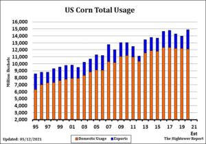 July corn managed small gains on a late rally. Early on, Managed funds were net sellers of 10,000 contract. At the end of the day they were net buyers of 2,000. Most of the recent fund selling was due to the recent private guess of US 2021 corn acres near 96 million versus USDA 91. This has trump talk of higher China buying US corn and lower Brazil crop. Today, USDA announced another 1.36 mmt of US 2021/22 corn sold to China. This could bring sales to 9-10 mmt. Some still feel China could take 40 mmt all origin corn in 2021/22 versus 30 this year. Trade also could see final Brazil corn crop below 90 mmt. This could add 325 mil bu to US 2021/22 corn export. Near the highs, Trade was talking a US 2021/22 corn carryout near 1,200 versus USDA 1,502. Informa 96 million acres suggest a carryout near 1,900. Today one group estimated Brazil corn crop near 91 mmt vs USDA 102. Weekly US ethanol production was up 5 pct from last year and 55 pct from last year. Stocks were up slightly from last week but down 17 pct from last year. Margins improved. Crushers continue to bid up for corn and most look for higher domestic summer fuel demand. Weekly US old crop corn sales are est near -300-400 mt vs -113 last week. New crop is est near 3,000 to 4,500 mt versus 2,083 last week.