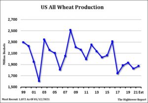 Wheat traded lower. Talk of better rains across US north plains and Canada prairie and continues rains across US south plains continued to weigh on prices. Talk that north Kansas 2021 wheat yields were highest in the 20 year history of the tour also weighed on prices. Higher US Dollar and fact US Fed minutes were hawkish and could move Dollar higher may push the Dollar higher also offered resistance. French wheat futures traded lower following lower US prices. Weekly US wheat export sales are expected to be near 150-350 mt vs 268 last week. WN ended near 6.79. Range was 6.71-6.99. KWN ended near 6.36. Range was 6.19 to 6.49. MWN ended near 6.97. Range was 6.85-7.14. USDA est World 2021/22 wheat trade near 202 mmt vs 199 this year. Russia 40 vs 39.5 ly, EU 33 vs 30, US 24 vs 26, Ukraine 20 vs 17, Canada 23.5 vs 30 and Austrália 20 vs 22.