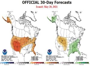 Soybeans traded lower. Soybean have gone from a high near 16.67 to today’s low near 15.23. Much of the drop was post USDA May report that failed to show tighter US 2020/21 carryout and tight US 2021/22 carryout. Some feel US 2021/22 carryout could be lower unless US 2021 soybean crop exceeds USDA guess. Managed funds also reduced longs as US 2 week and 30 day weather forecast suggest normal to above temps and normal rains. This should be good for crops. Weekly US soybean export sales were near 3 mil bu. Total commit is near 2,258 vs 1,517 last year. USDA goal is 2,280 vs 1,682 last year. China shipments are near 1,284 mil bu with totals commit near 1,298. Some feel they could take 1,395 mil bu in 2021/22. New crop sales were 3 mil bu with unshipped open sales near 258 mil bu. Soymeal prices continue to trend lower on higher Argentina supply and talk of lower World hog and soymeal prices.