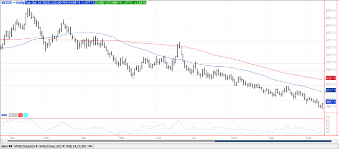 Wheat futures are mixed. Following drone strike on Russia ships in Crimea, Russia increase bombing key Ukraine infrastructure. Russia also announced an end to Ukraine export corridor. Russia then said that the deal was only suspended. According to Ukraine there are 218 vessels blocked, 22 loaded and wanting to leave, 95 left loaded waiting for inspections and 101 waiting for inspection to enter Ukraine ports for loading. USDA rated the 2023 US winter wheat crop 28 pct G/E and lowest ever for this week. TX is 5, OK 11 and KS 24. Argentina wheat crop is getting smaller due to dry weather. US south plains remains mostly dry. Matif rallied sharply in the last hour of trade. Early trade was flat as Ukraine would continue to ship grain from Black Sea ports. Putin’s statement that he would only consider a resumption of the grain deal after a full investigation into the Sevastopol attacks sent Matif higher.  Rumors continued to circulate that GASC was in more direct discussions to buy wheat. Egypt’s trade ministry appeared to say that Egypt would import only another 1 mmt prior to the local harvest in April 2023.Argentina is reportedly ready to allow export license delays but with no details.