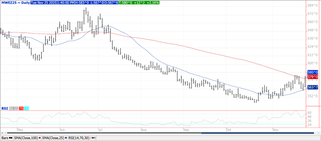 Prices were $.04-$.12 higher across the 3 classes today. Inside trade for Dec-25 CGO. Dec-25 MIAX surged thru its 100 day MA however stopped shy of its November high at $5.84 ½. Spreads firmed across all 3 classes. US winter wheat plantings at 97% were in line with YA and the 5-year Ave. Crop ratings improved 3% to 48% G/E, still below the 55% from YA. As of yesterday there was 34 contracts registered for delivery against SRW wheat and 176 for HRW. Exports at 23 mil. bu. brought YTD commitments to 568 mil. bu. up 25% from YA, vs. the USDA forecast of up 9%. Shipments at 382 mil. bu. were up 20% YOY. EU 25/26 soft wheat exports at 9.2 mmt are down 5% YOY. IKAR expects Russian wheat production to range from 86-91 mmt in 2026.
