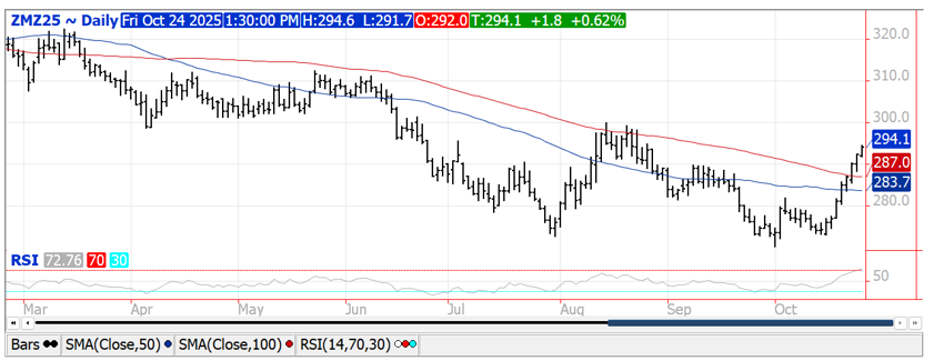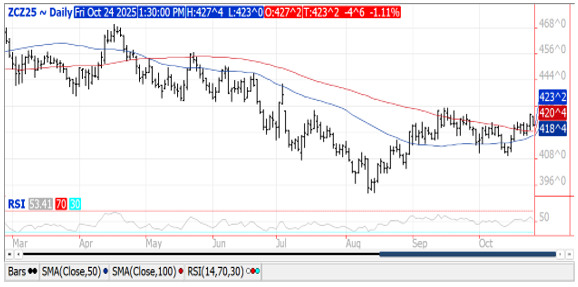 Prices were mostly lower across the complex with beans down $.01-$.03, meal is up $2-$4 while oil has backed up 50-60 points. Spreads weakened across the complex. Nov-25 beans did scratch out a fresh 5-week high overnight before pulling back. Next resistance is at the Sept. high at $10.53. New 2 month high for Dec-25 meal with next resistance at the August high near $300 ton. Meal has closed higher 9 consecutive sessions with speculative traders being net buyers every day which still leaves MM’s short roughly 95k contracts. Inside trade for Dec-25 oil as it consolidates between $.50 lb. and its 50 day MA, currently 51.39. With no confirmation of yesterday’s rumored Chinese interest in US soybeans speculative traders turned moderate sellers today. Talks between USTR Greer and Treasury Sec. Bessent with Chinese trade delegates this weekend in Malaysia could drive price volatility Sunday night. Trump continues to talk up his relationship with Pres. Xi, we’ll see if he and his administration can delivery for the US farmer. Without a trade deal and Chinese buying combined with no weather problem in SA look for spot prices to quickly pull back into the $9.80-$10 range in November. Since the end of Sept-25, January beans have moved up $.40 bu. In the previous 15 years in the Oct thru Nov. timeframe prices have been lower 9 times while higher 6 times.