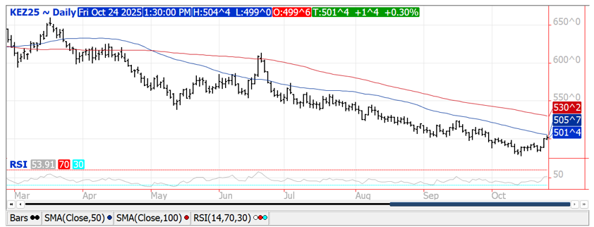 Prices closed the session mixed while holding within a couple cents of unchanged across all 3 classes. Fresh news was limited as futures were not able to hold early strength. Resistance for Dec-25 CGO is the 50 day MA at $5.17 ½, for Dec-25 KC it’s $5.06, for MIAX its $5.67 ¾. All 3 classes have been below the technical indicator since June or July. Argentine wheat harvest is underway with 5% of the crop gathered so far according to the BAGE. They kept their production forecast unchanged at 22 mmt, below the Rosario Grain Exchange forecast of 23 mmt, however well above the USDA est. from Sept at 19.5 mmt. Speculative traders bought roughly 4k contracts of CGO wheat yesterday, cutting their net short position to 93K contract. O.I. for both CGO and KC fell just over 2k contracts suggesting short cover. Russia’s Ag. Ministry increased their wheat export tax 69% to 167.7 rouble/mt for the period ending Nov. 6th, still quite low by historical standards.