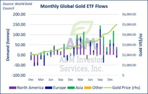 - The US Dollar Index has advanced over 2% over the past month, weighing on gold prices, while investors have shifted portfolio allocations toward cash instead of traditional safe havens.
