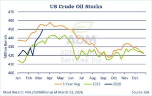 - This “worst case” scenario that stopped the movement of roughly 20% of global oil supply sent nearby crude prices to their highest level since June 2022, when the market was reacting to Russia’s invasion of Ukraine and the subsequent attempts on the part of the US and EU to sanction Russian oil shipments. US WTI prices have since backed off from their March 9 highs but Brent prices have not, as that market is more responsive to actions in the Gulf. Middle East benchmark Dubai and Oman premiums recently hit all-time highs if $65 per barrel. US crude oil stocks have increased.