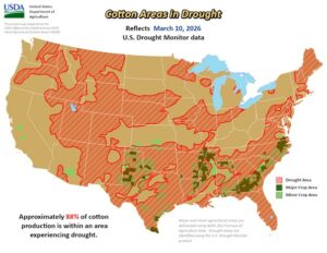 - Drought conditions across most of the US cotton belt raise concerns about US crop prospects in 2026. The recent US drought monitor showed an area representing 88% of US cotton production was experiencing drought, up from 33% a year ago.