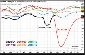 In the four weeks ended April 9, U.S. ethanol output averaged 951,000 barrels per day, off the recent highs observed in November and December and 6.6% below the 2017-2019 average for the same period. That departure from normal is a post-pandemic best. The latest production average reflects a slight downturn from the late March levels, somewhat consistent with seasonal trends for the time of year.