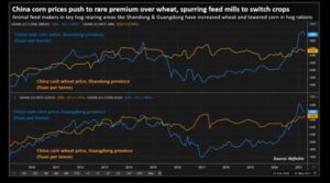 China’s wheat feeding to pigs and poultry has dented demand for alternate feeds and clouded the market outlook for soybean meal and other key ingredients used by the country’s massive feed sector. Chinese feed producers have sharply raised wheat purchases in the past several months to replace corn, which has rallied by more than a third in the past year to a rare premium over wheat following a drop in corn output and state stockpiles last season. Greater feed use of wheat, which has more protein than corn, has also cut demand for soymeal, the main protein source in livestock rations, putting further pressure on local crushing margins and raising questions about China’s appetite for soybeans just as U.S. farmers gear up to commit more than 87 million acres to the crop.