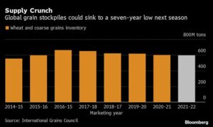 The International Grains Council cut its inventory estimate for the 2021-22 season to 595 million tons, the lowest in seven years, according to a report published Thursday. Rising animal-feed demand and a drought-stricken Brazilian corn crop are outweighing bumper harvests elsewhere, shrinking the world’s grain supply cushion for a fifth straight season.