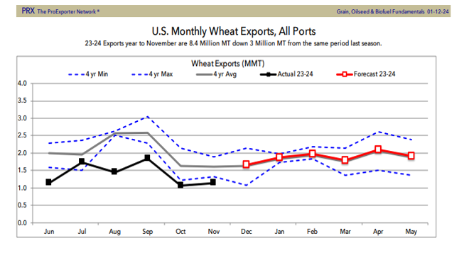Wheat futures are lower. WH is near 5.92. KWH 6.19. MWH 6.91. Recent WH range has been 5.84-6.17. Funds added to shorts on Wednesday. Russia and EU wheat prices remain a discount to US. Wheat trade trying to price in drop in US and EU 2024 winter wheat acres vs higher monthly US wheat state crop ratings and higher EU and Russia available export supplies. US wheat export sales are est at 275-600 mt vs 451 last week. NE Africa remains dry. US plains and Canada weather is improving. Global wheat import demand has slowed as buyers search for funding. Red Sea unrest could also be slowing demand.