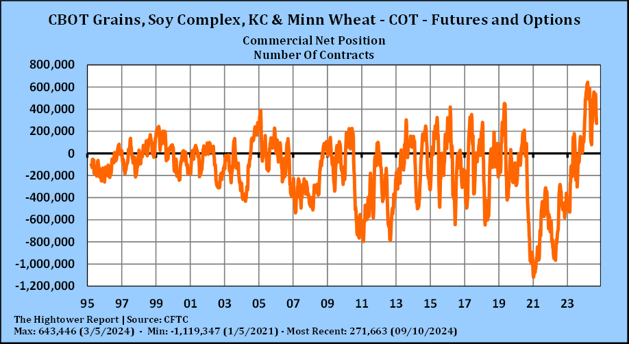 SX is near 10.06. Some feel SX could be in a choppy 9.55-10.31 range. US domestic soybean basis is lower ahead of harvest. SX-SF spread remains wide. Weekly crop exports were 401 mt, This was below expectations, USDA announced 132 mt US soybeans to unknown. USDA rated the crop 64 pct G/E, down 1 pct from last week. IA 77, IL 72, NE 65. OH 40. Harvest is 6 pct. LA 46. MS 44. AR 29. Key to soybean futures could be South America weather over next 45 days. Forecast is dry and warm across C and N Brazil. Palmoil is lower. India increased import duty.